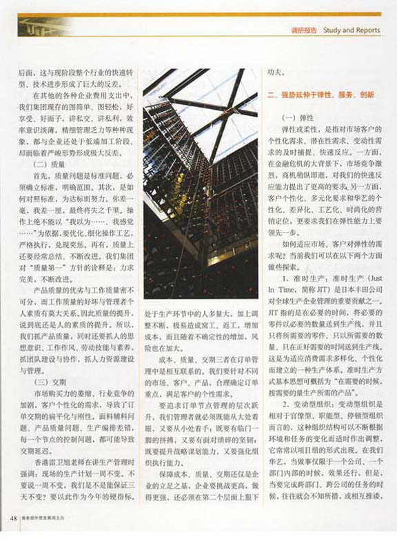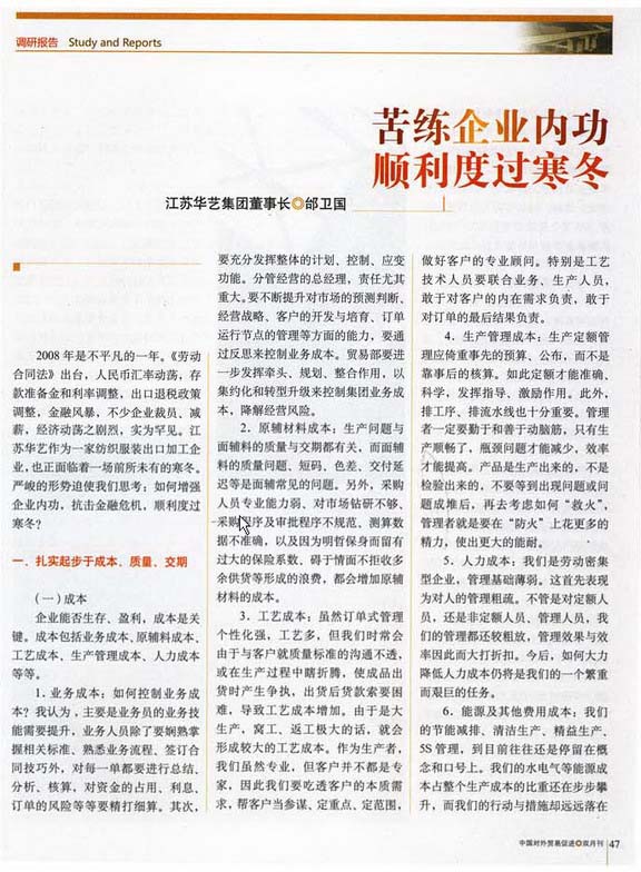 剛剛過去的2008年,是極不平凡的一年?!秳趧雍贤ā烦雠_,人民幣匯率動蕩,存款準備金和利率的頻繁調(diào)整,出口退稅政策的反復(fù),加之9月份之后的金融風(fēng)暴,不少企業(yè)裁員、減薪,經(jīng)濟動蕩之劇烈,調(diào)整力度之大,實為罕見。江蘇華藝作為出口加工的紡織服裝企業(yè),也正面臨著一場前所未有的寒冬。如何增強企業(yè)內(nèi)功,抗擊金融危機,順利度過寒冬? 一、扎實起步于成本、質(zhì)量、交期 1、成本 企業(yè)能否生存、盈利,成本是關(guān)鍵。成本包括:業(yè)務(wù)成本、原輔料成本、工藝成本、生產(chǎn)管理成本、人力成本等等。 1)業(yè)務(wù)成本。在華藝,由于經(jīng)營龍頭作用發(fā)揮不力,業(yè)務(wù)成本的虛高與隱形浪費是各項成本損失中******的一項。由于市場不明、行業(yè)不熟、與客戶的溝通了解把握引導(dǎo)浮于表面、經(jīng)營中的價格交期質(zhì)量標準付款方式等節(jié)點問題含糊不清似是而非,從而導(dǎo)致“問題訂單”頻頻。而作為加工企業(yè),利潤空間極其微薄,每每出現(xiàn)此類“問題訂單”,總要用多筆同等數(shù)量的訂單來彌補。 如何控制業(yè)務(wù)成本?主要是業(yè)務(wù)員的業(yè)務(wù)技能需要提升,業(yè)務(wù)人員除了要嫻熟掌握相關(guān)標準、熟悉業(yè)務(wù)流程、簽訂合同技巧外,對每一筆單都要進行總結(jié)、討論、分析、核算,精打細算到資金的占用、利息、訂單的風(fēng)險等等。其次,是要充分發(fā)揮出經(jīng)營的整體系統(tǒng)前瞻性的判斷把握設(shè)定計劃控制應(yīng)變功能。由于訂單不暢,導(dǎo)致空運,由于供應(yīng)滯后、生產(chǎn)拖延、影響交付、客戶索賠,都間接導(dǎo)致了業(yè)務(wù)成本和經(jīng)營風(fēng)險居高不下。 問題有的出在業(yè)務(wù)員跟單員身上,但往往有的根子卻出在分管業(yè)務(wù)的總經(jīng)理身上。我們負責(zé)經(jīng)營的總經(jīng)理,任重道遠。我們在經(jīng)營者的綜合素養(yǎng)和能力、市場的預(yù)測判斷、經(jīng)營戰(zhàn)略思路、細分市場目標客戶的開發(fā)與培育、業(yè)務(wù)員的指導(dǎo)帶教把關(guān)控制、訂單運行節(jié)點的預(yù)見與疏導(dǎo)等諸方面的反思、補缺、積累、提升,都已是凸顯而緊迫的課題。 貿(mào)易部要進一步發(fā)揮企業(yè)集團的營銷牽頭、規(guī)劃、整合、管理的職能作用,以專業(yè)化集約化和轉(zhuǎn)型升級來控制業(yè)務(wù)成本,降解經(jīng)營風(fēng)險。 2)原輔材料成本。近年來,我們有超過半數(shù)以上的生產(chǎn)問題與面輔料的質(zhì)量與交期有關(guān),面輔料質(zhì)量問題、短碼、色差、交付延遲等是面輔料屢見不鮮的問題。另外,專業(yè)能力弱、鉆研市場嚴重不夠、采購的程序、審批的程序不規(guī)范、測算的數(shù)據(jù)不準確,因為明哲保身而留有過大的保險系數(shù)、供方多供貨而礙于情面不拒收等形成的浪費,也直接導(dǎo)致了原輔材料成本增高。 3)工藝成本。訂單式管理,個性化強一些,工藝多一些,這是事實。但往往由于與客人的質(zhì)量標準溝通不透,生產(chǎn)過程中瞎折騰,成品出貨時有爭執(zhí),出貨后貨款索要困難,事先的把關(guān)、決策、控制不力,導(dǎo)致工藝成本增加。由于是大生產(chǎn),由于工藝問題形成的窩工、浪工、返工極大,因此工藝成本是大成本,而又是無形的成本。我們做的是專業(yè),而客人并不都是專家,我們要深入了解吃透客人的個性本質(zhì)需求,幫客戶當(dāng)參謀、出主意、定重點、定范圍,為客戶積極創(chuàng)造專業(yè)顧問的價值。工藝技術(shù)人員要聯(lián)合業(yè)務(wù)、生產(chǎn)人員,發(fā)揮有效的技術(shù)管理,敢于承擔(dān)責(zé)任,敢于對客戶的內(nèi)在需求負責(zé),敢于對訂單的最后良好結(jié)果負責(zé)。 4)生產(chǎn)管理成本。生產(chǎn)上涉及的人員面廣量大,生產(chǎn)定額管理應(yīng)事先預(yù)算、公布,而不是事后核算。定額要準確、科學(xué),有指導(dǎo)性、激勵性。工業(yè)化生產(chǎn),排工序、排流水線也十分重要,管理者一定要勤于善于動腦筋、想辦法把時間、精力花在設(shè)定上,生產(chǎn)順暢了,瓶頸問題自然就少了,效率就提高了。產(chǎn)品是生產(chǎn)出來的,不是檢驗出來的,不要等到出現(xiàn)問題或問題成堆后,再去考慮如何“救火”,管理者就是要花出更多的精力、使出更多的能耐在“防火”上。 印繡洗的二次外發(fā)加工和生產(chǎn)性的外發(fā)加工,都急待加強計劃性與控制性。 5)人力成本。我們是勞動密集型的企業(yè),而管理基礎(chǔ)脆弱,又首先表現(xiàn)為人的管理的粗疏。不管是定額人員,還是非定額人員、管理人員,我們都處于一個粗放管理的階段,人力管理的效果、效率大打折扣,大力降低人力成本是我們抗寒冬的一個繁重而艱巨的任務(wù)。 6)能源及其它費用成本。我們的節(jié)能減排、清潔生產(chǎn)、精益生產(chǎn)、5S管理,往往還是停留在概念和口號上。我們的水電氣等能源成本占整個生產(chǎn)成本的比重在步步攀升,而我們的行動與措施卻遠遠落在后面,這與現(xiàn)階段整個行業(yè)產(chǎn)業(yè)的快速結(jié)構(gòu)轉(zhuǎn)型、技術(shù)進步形成了巨大的反差。 在其它的各種企業(yè)費用支出中,圖簡單、圖輕松,好享受、好面